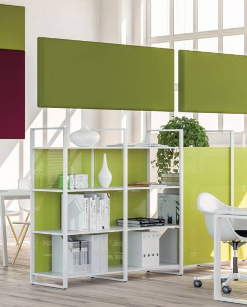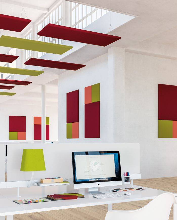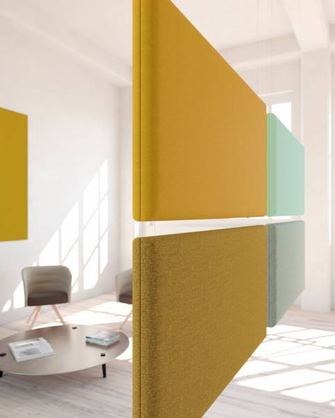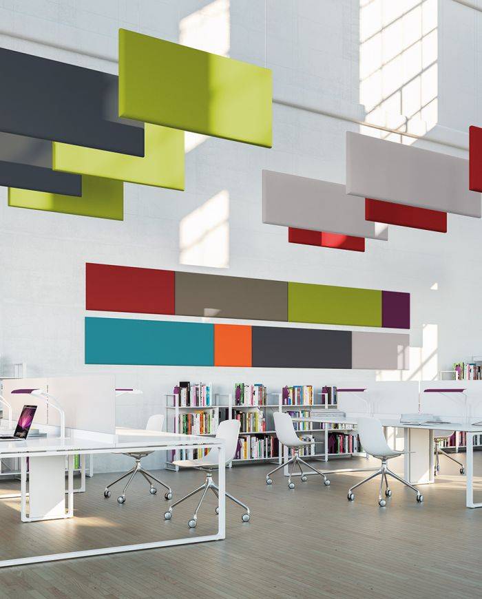 Associés aux panneaux muraux, les panneaux suspendus horizontaux apportent une touche très graphique à votre environnement et renforcent son confort acoustique.