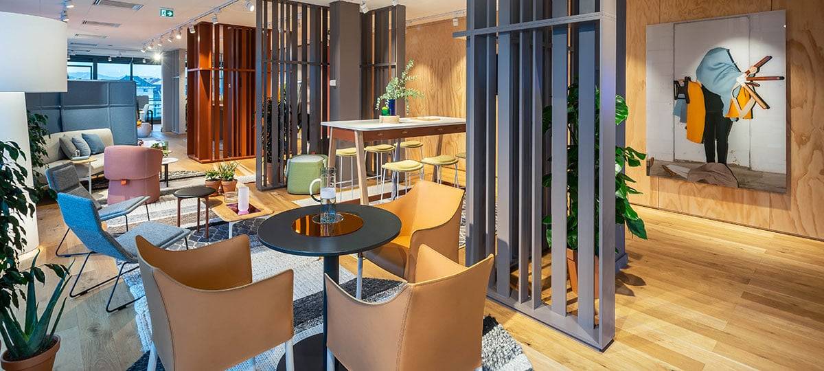 L’entrée du showroom donne le ton avec une ambiance qui crée une authentique première impression. Elle a été conçue non seulement pour refléter la marque Haworth, mais aussi pour inspirer leurs visiteurs avec des solutions polyvalentes et réfléchies – véritable point de départ de l’hospitalité au travail.
