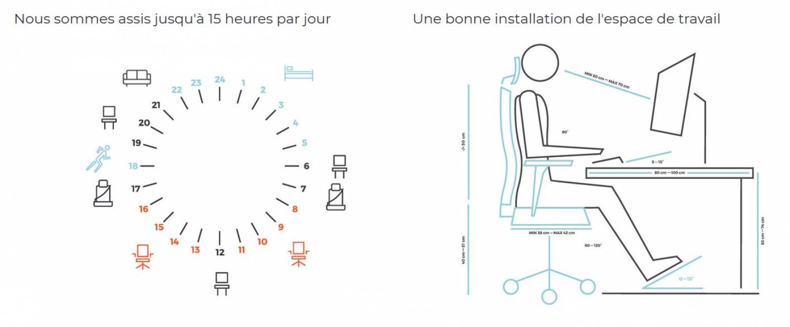 Nous sommes souvent assis au moins 12 heures par jour. Au travail, à la maison, au cinéma ou à un dîner. Pendant la majeure partie de ce temps, nous restons assis immobiles dans la même position et nous fatiguons ainsi la colonne vertébrale et le reste de l'appareil locomoteur. Les vertèbres sont soumises à une pression extrême, les organes internes sont compressés et une tension se crée au niveau de la colonne vertébrale et de la nuque. D'ailleurs, regardons cela de plus près.